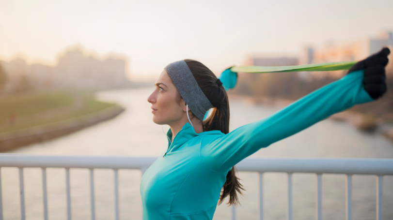 Interlace your fingers behind your back and lift slightly. This opens your chest and corrects rounded shoulders.