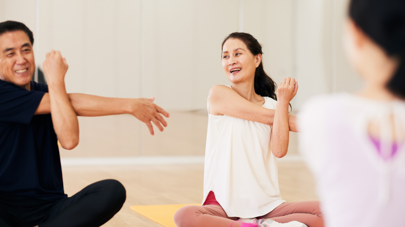 Hold the back of your chair and rotate gently. This improves mobility in the mid-back and reduces stiffness.