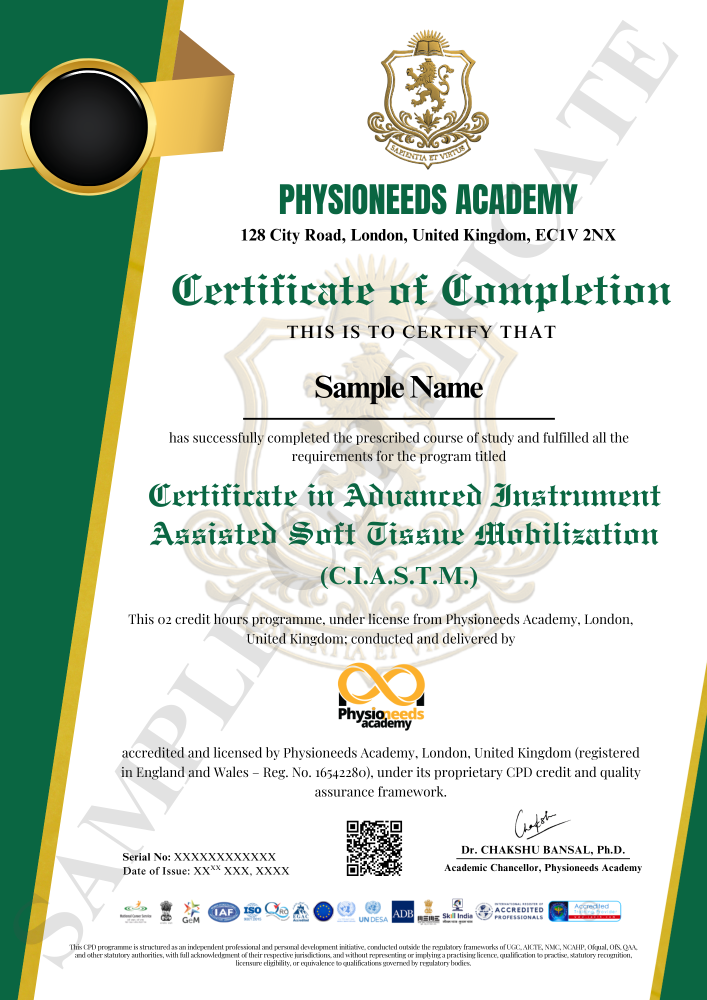 The Certified Advanced Expert (सिएसएमई) course is an in-depth exploration of the art and science of Instrument Assisted Soft Tissue Mobilization techniques. Tailored for physiotherapists, sports therapists, and healthcare professionals, this program covers advance-IASTM applications. Participants will learn to assess, diagnose, and apply Advanced IASTM techniques for various conditions, including musculoskeletal, neurological, pediatric, women's health, biomechanical, and postural dysfunctions. Whether addressing athletic injuries, chronic pain, or rehabilitation, this course provides Advanced-IASTM techniques and real-world clinical applications to enhance your practice.