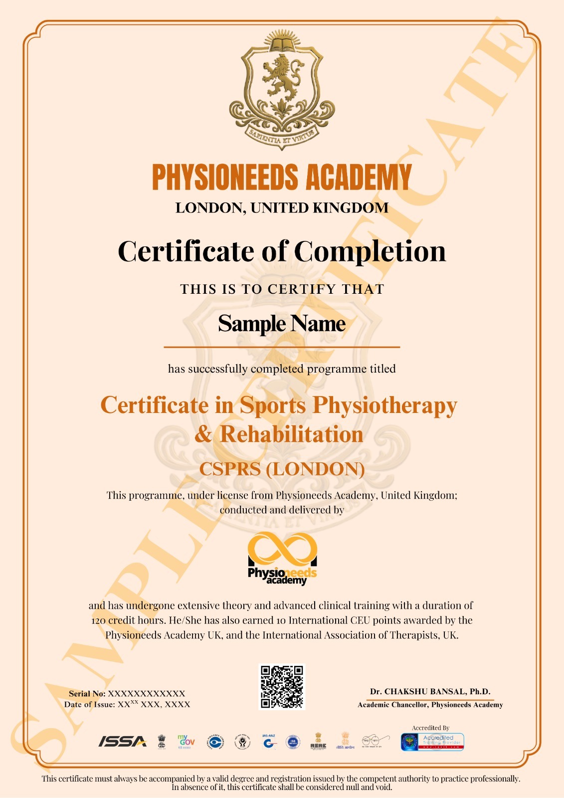 The Certified Sports Physiotherapy & Sports Rehab Specialist (CSPRS) program is designed for physiotherapists aiming to enhance their expertise in sports injury management, rehabilitation, and performance enhancement. Led by Dr. Chakshu Bansal, a global leader in sports therapy and rehabilitation, this course provides a comprehensive, clinical approach to treating and preventing sports injuries.This program covers advanced assessment techniques, manual therapies, exercise prescription, taping methods, and rehabilitation protocols used by top sports therapists worldwide.